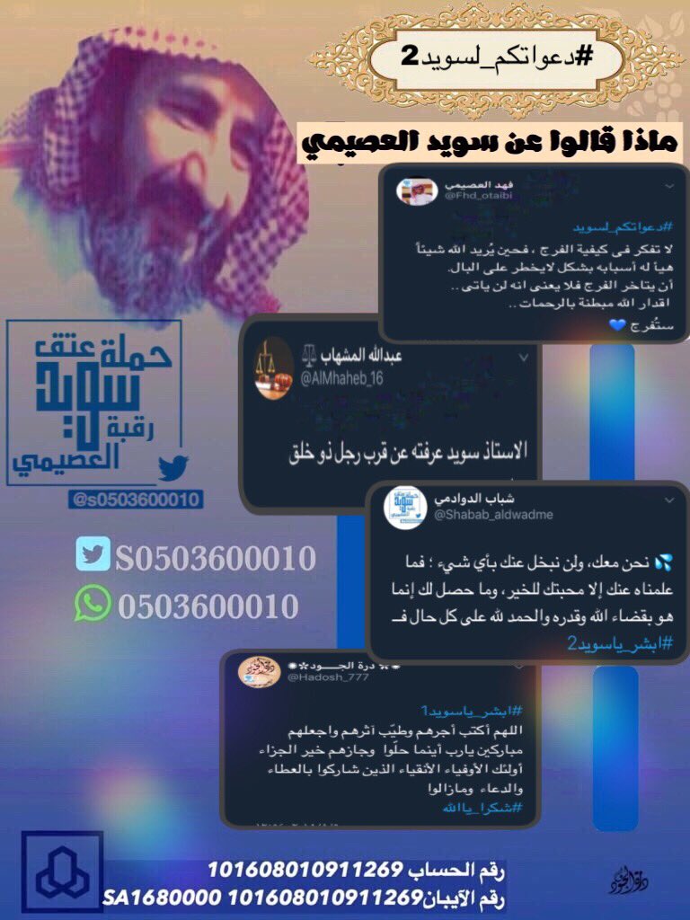 أ سويد العصيمي On Twitter إ ن الل ه ي ح ب ال م ت و ك ل ين اية ١٥٩ آل عمران بسم الله توكلنا على الله مستمرين في العطاء دعواتكم لسويد5 كتب الله أجر من ساهم ودعم ودعى وآزر