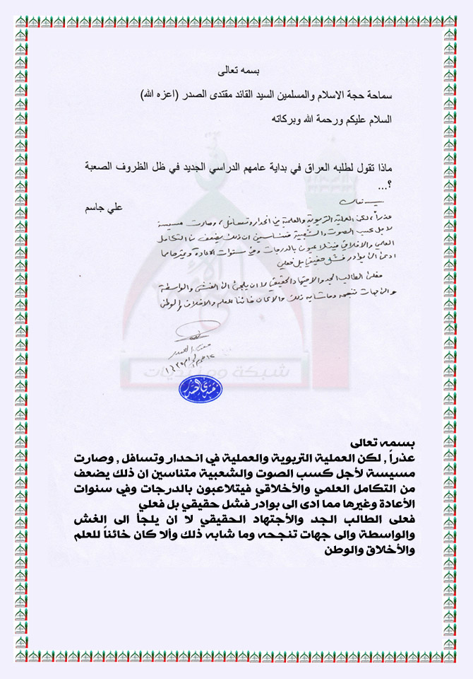 كلمة الى الطالب العراقي بمناسبة العام الدراسي الجديد استفتاء السيد القائد مقتدى الصدر اعزه الله 17 11 2013 منتدى جامع الائمة الثقافي
