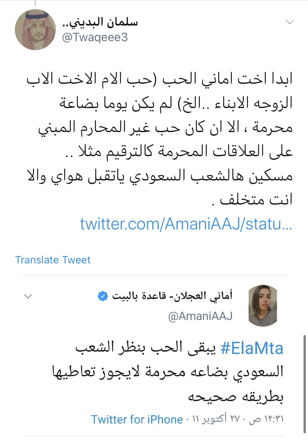 أماني العجلان على تويتر سلمان البديني حصر الحب بنظره انه ترقيم وعلاقات محرمة ولا اعلم من اين اتى بهذه الفكرة كلن يرى الناس بعين طبعه ياسلمان الحب حلال والحرمانية بافكارك القذرة فلا