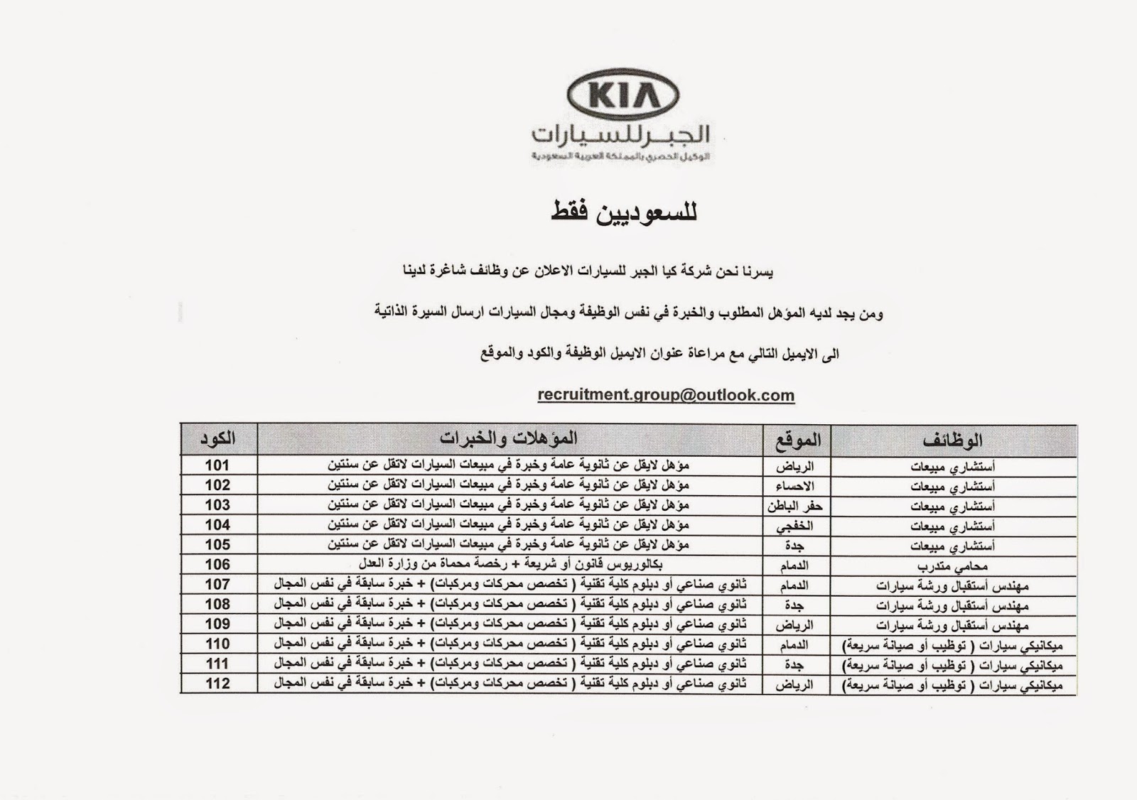 وظائف كيا الجبر في الرياض الاحساء جدة الدمام حفر الباطن الخفجي لحملة الثانوية واعلى استشاريين مبيعات ومهندسين وميكانيكا